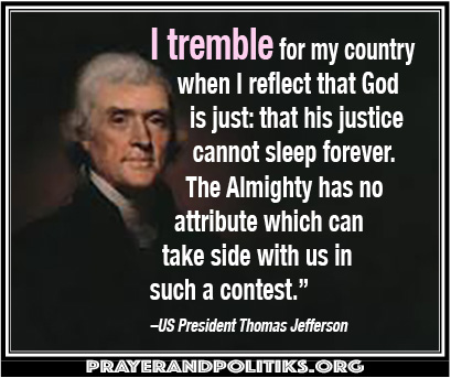 ¶ “I tremble for my country when I reflect that God is just: that his justice cannot sleep forever . . . The Almighty has no attribute which can take side with us in such a contest.” —President Thomas Jefferson